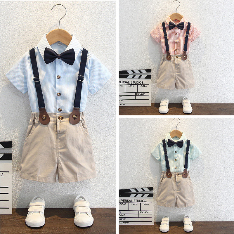 儿童套装夏季条纹衬衫短袖背带裤韩版男童主持合唱演讲表演礼服热门设计联盟服务商